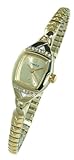 Quartz movement, Dress watch, Gold-tone hands, numbers, and dot-markers, Polished gold-tone stainless steel bezel, case and crown, Horizontal line of seven Swarovski crystals on top and bottom of bezel, Stainless steel case back, Not water resistant..